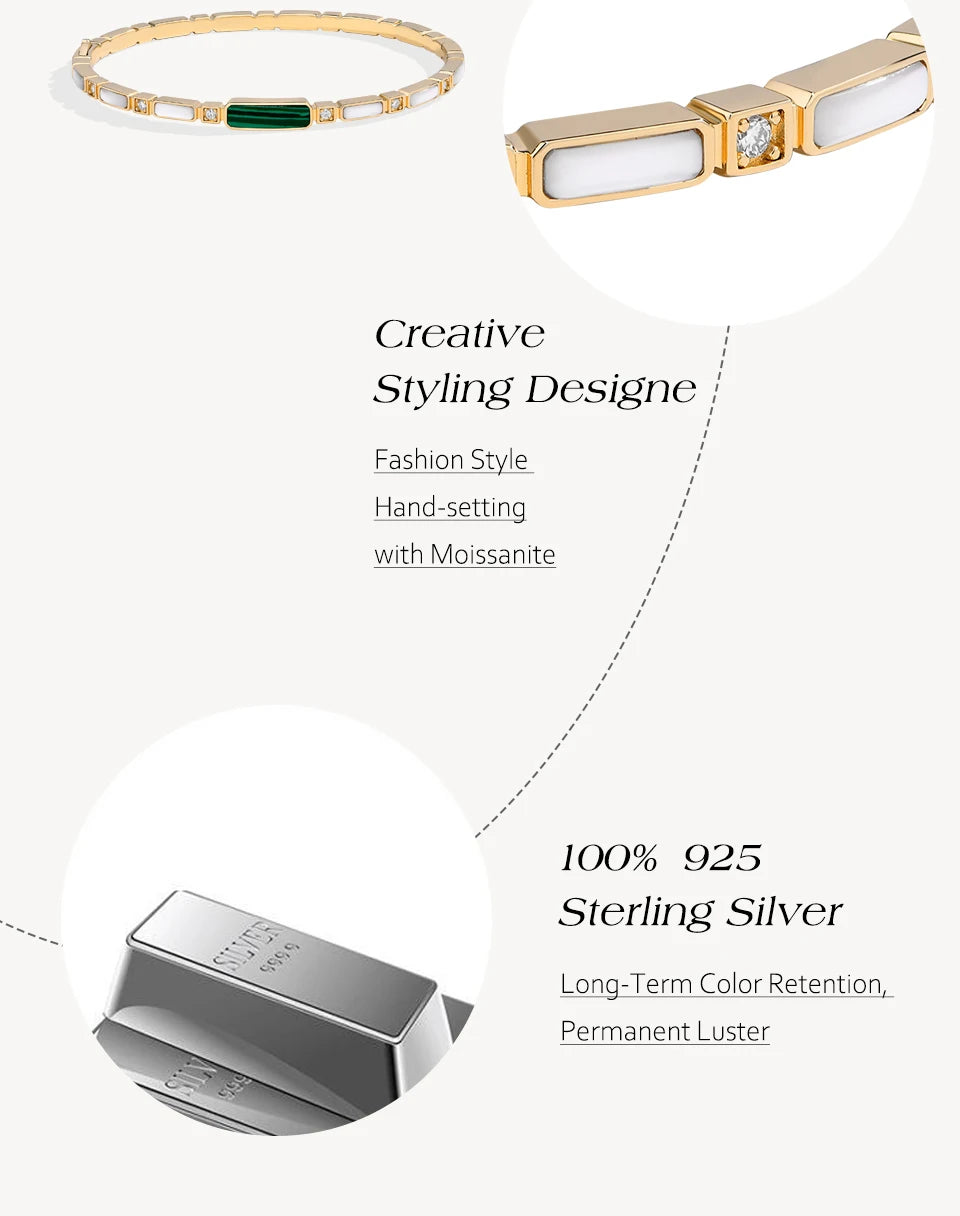 A refined combination of style symbolism and sophistication this luxury bangle bracelet blends the deep green allure of synthetic malachite with the radiant brilliance of moissanite stones