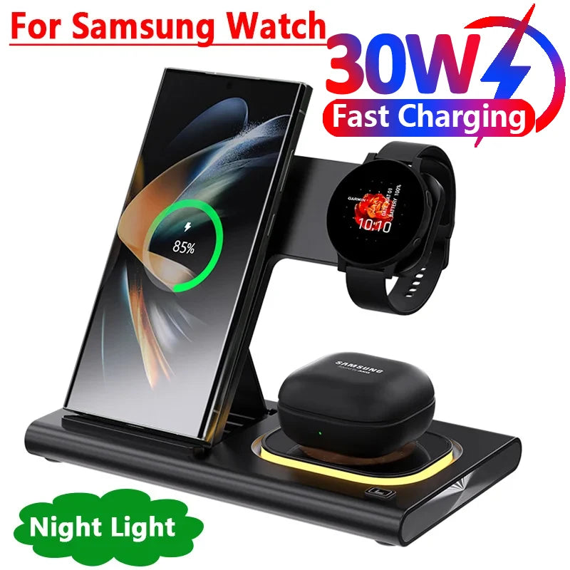 Triple Functionality: Charge your Samsung S24, S23, S22, and Galaxy Watch 6, 5, 4, Active 1, 2 simultaneously, along with your Galaxy Buds—everything you need in one sleek device!