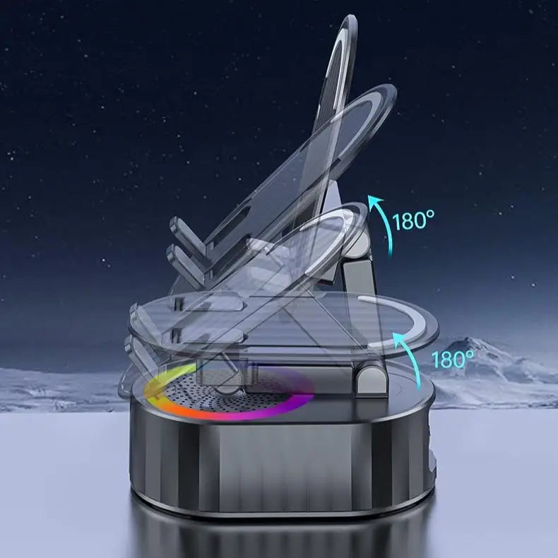 The Ultimate 5-in-1 Smart Solution Our Wireless Induction Audio Bluetooth Speaker combines powerful sound, phone holder, tablet stand, and emergency power bank in one sleek device. Designed for modern lifestyles, it simplifies your setup while delivering high-quality audio and functionality