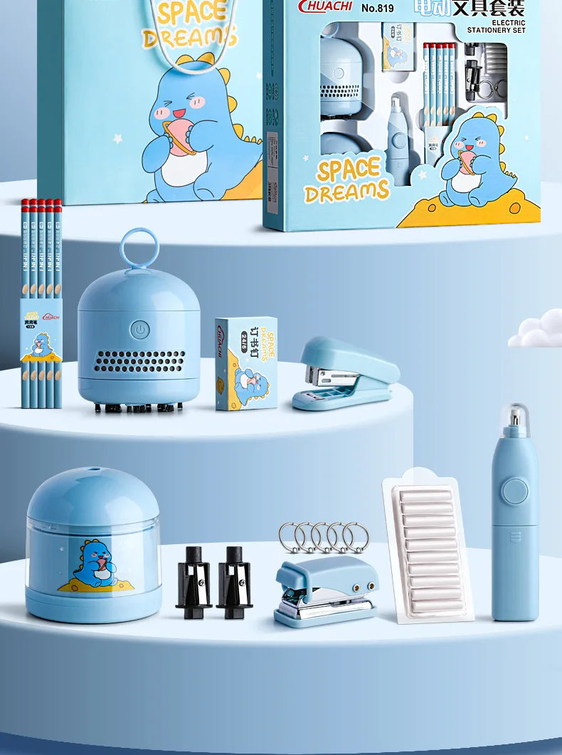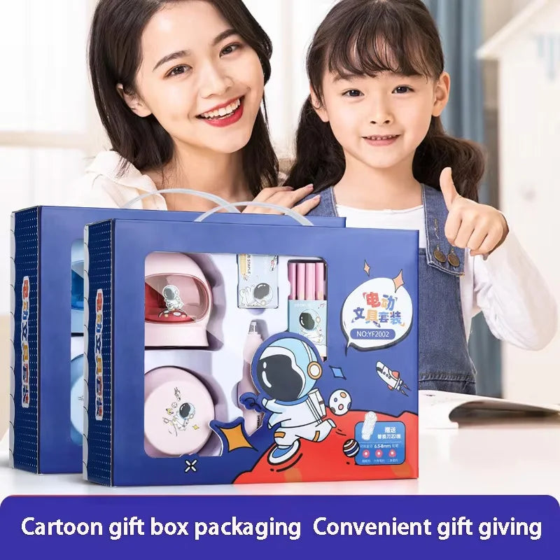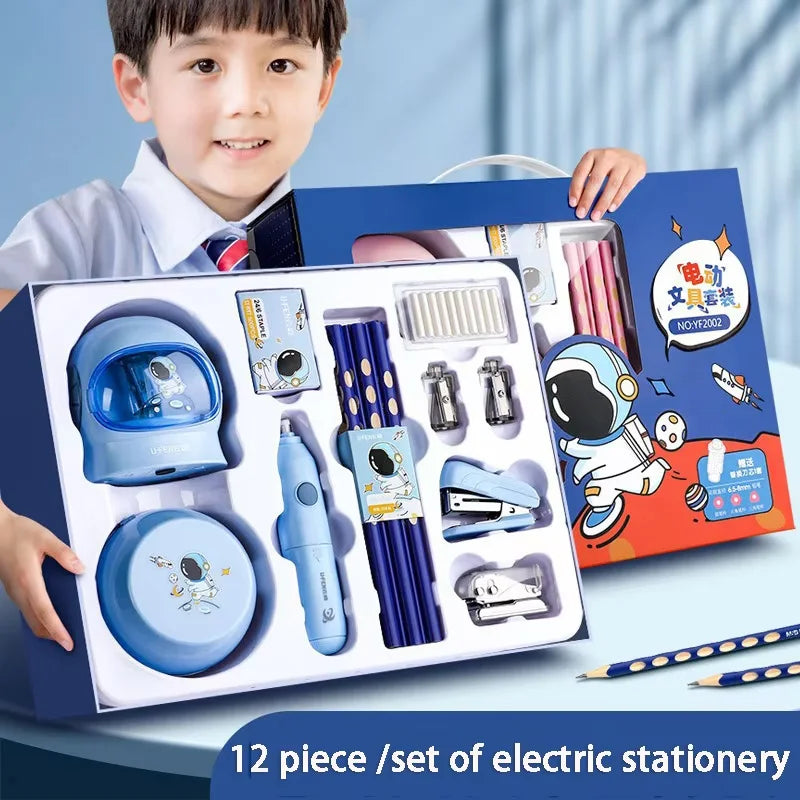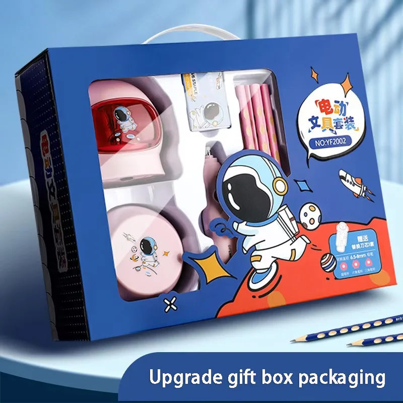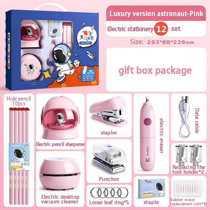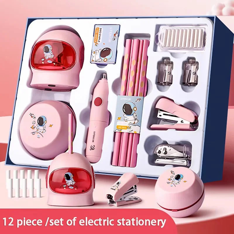 Conjunto de 12 peças de papelaria elétrica para astronautas, afia-lápis elétrico e borrachas
